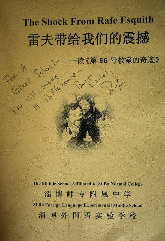 会场休息期间,我校教师与雷夫先生就教育教学问题展开了热烈交流,畅谈了阅读《第56号教室的奇迹》的收获心得。对于学校以人为本、关爱学生的办学理念,教师热爱教育、主动发展的职业精神,雷夫先生表示了高度认可,并为教师论文集——《雷夫带给我们的震撼》欣然命笔题词:For a great school,you all make a difference.(致一所优秀的学校,你们将有所作为)。