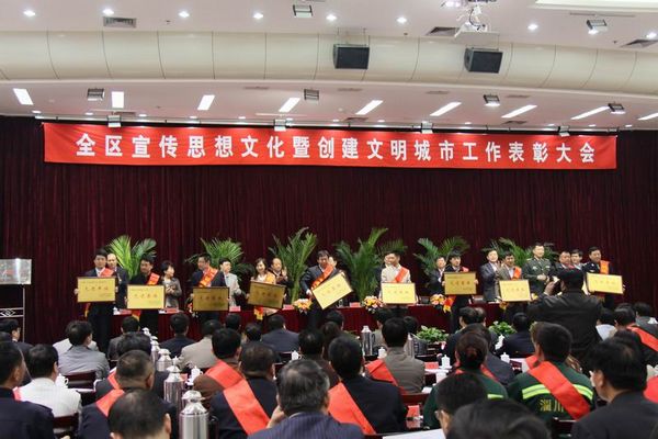会议首先举行了省级文明区的揭牌仪式,区委常委、宣传部部长白相房同志宣读区委区政府《关于表彰2011年度全区学习型党组织建设、非物质文化遗产传承、文化建设、文化产业发展、民生政策宣讲、通讯报道工作先进单位和先进个人的决定》;区政府副区长孙月东同志宣读区委区政府《关于表彰全区文明城市创建工作先进单位和先进个人的决定》,会议还倾听并学习了区委书记、区人大常委会主任杨洪涛同志的重要讲话,唐学玲、孟强、陈秀锦获个人表彰。
