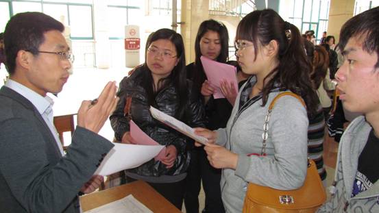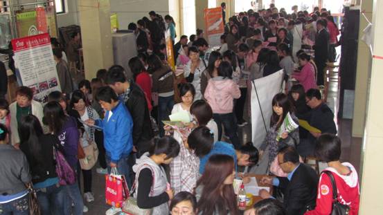 为进一步搭建用人单位与我校毕业生供需交流平台,拓宽毕业生就业渠道,4月21日上午,由招生就业处主办、数理科学系承办的2012年招聘会在2号教学楼一楼大厅成功举办。本次招聘会吸引了来自省内35家机构和教育单位赴会,提供就业岗位500余个,我校毕业生、部分院系党总支副书记、招生就业处老师参加。
