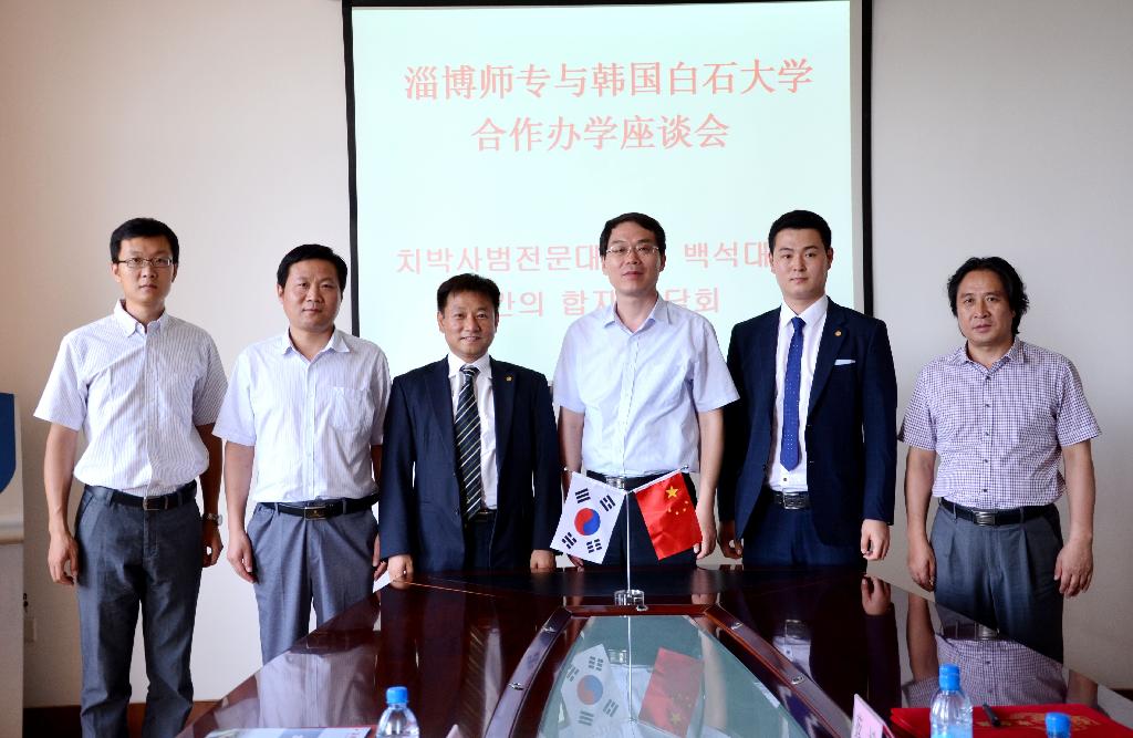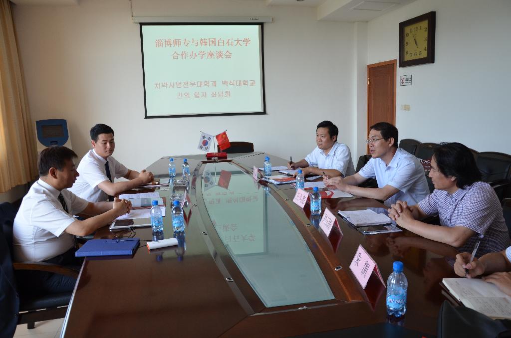 2日下午,淄博师专与白石大学合作办学座谈会在办公楼三楼举行。王久亮对白石大学的来访表示欢迎,就两校前期的交流合作成果表示肯定;会谈中,王久亮指出,目前我校非常支持正在进行的交换生互派,3+2合作办学等两校合作项目,对双方在在老年服务与管理专业方面进行的合作探讨表示认同,期待双方就这方面的问题进一步深入交流。白石大学崔东星表示,感谢淄博师专的热情接待,两校前期的交换生派遣项目开展顺利,必将成为双方深化合作的良好切入点,白石大学欢迎有更多的淄博师专学生来韩国交换学习,自2016年开始,将为淄博师专提供至少六个交换生名额;白石大学的老年福祉专业有博士点和硕士点,教学水平在韩国名列前茅,可以为淄博师专学生开设3+2专升本和3+4专升硕项目;如有需要,白石大学可以向淄博师专派遣高水平韩语教师,提高学生的韩国语水平;同时,回国之后将就两校老年福祉专业深入合作和共同建设养老机构等问题向学校领导汇报,期待此行的座谈成果能够尽快落实。