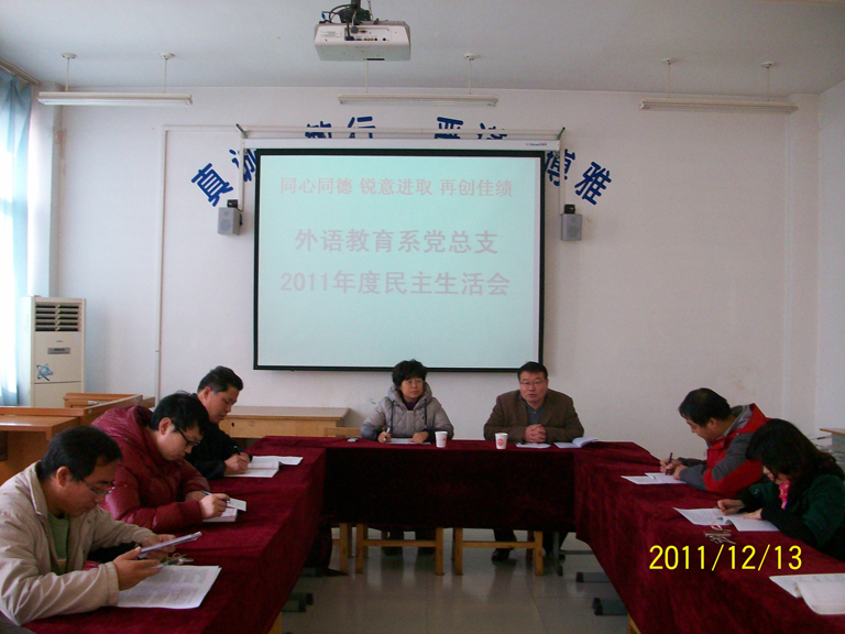 根据学校关于召开基层组织专题民主生活会的要求,外语教育系于12月13日下午召开了以“坚持以人为本理念,增强党性修养,提高教育教学质量,服务学生健康成长”为主题的民主生活会。学校党委委员、副校长郭小文,外语系党总支和各支部委员参加了会议。