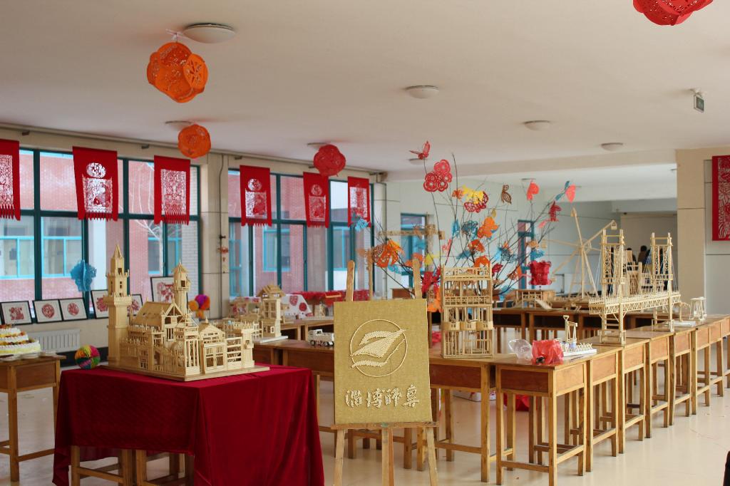 “竹筷手工艺作品”的创作者王艳童同学为艺术教育系2010级美术教育4班学生,2010年开始,他在翟玮老师的指导下钻研用一次性筷子制作手工艺品,作品多次在省、市级比赛中获一、二等奖,2010年9月开始,他创建了“Dream High”工作室,已有成员一百多人。本次展览不仅展出了其近期创作的建筑、交通工具及娱乐设施等手工艺造型,还展出了专为我校制作的校徽标志。剪纸作品是王继红老师本学期在选修课中指导学生的作品,内容不仅涉及传统剪纸窗花、门笺、墙花、灯花等,还有剪纸元素与现代包装设计相结合的作品,体现了传承与发展理念的结合。火红的色彩装扮了艺术楼大厅,驱走了严寒,为学校增添了浓烈的喜庆气氛。