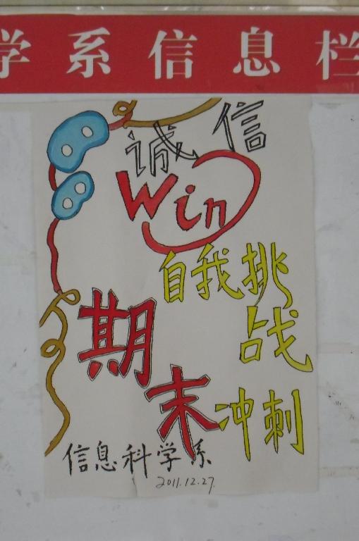 元旦将至,也迎来了新学年第一学期的期末考试,为确保期末考试顺利进行,信息科学系多角度宣传诚信考试,一是组织各班开展“诚信考试”主题班会;二是宣传部制作“诚信考试”的海报进行宣传引导;三是学习部向各班发放诚信考试倡议书。