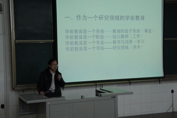 4月12日下午3:30,应学前教育学院邀请,山东师范大学教育学院博士丁海东为我院全体教师做了题为《关于学前教育研究的几点思考》的专题讲座。丁海东博士是山东师范大学学前教育学学科带头人。中国学前教育研究会理事会理事,中文核心期刊《学前教育研究》编委,《幼儿教育》(教科版)编委,中国学前教育研究会学术委员会委员,全国高等师范学前教师教育教材审稿专家。