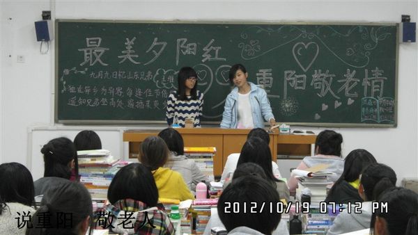 此次活动的内容异彩纷呈:10月18日晚,以“最美夕阳红”、“九九重阳”为主题的团课在系内各个班级中温暖展开,团课中,同学们就“重阳节”的来历、有关故事、有关诗词等展开讨论;10月19日,青年志愿者队组织同学们“登高舒怀”登爬奂山,体验一把“九月九日望乡台,他席他乡送客杯”的愁思之情。并于当日下午到郝家村看望老人,青年志愿者们为老人们带去了日常生活用品和新鲜可口的水果,他们和老人们亲切交谈,欢乐成一家,在这个特殊的节日,为老人们消除孤独感,送去温暖;10月20日,针对我系2012级在校新生举办了“手抄报”和“亲情电话一连心”活动。手抄报的内容丰富多彩,主要有关重阳的诗词、故事节日的由来。或许,正是这样特殊的节日,让同学们不禁想念家中的长辈与亲人,大部分同学更是拨去亲情号码,与家中亲人温馨交谈,送去温情话语,感人至深。