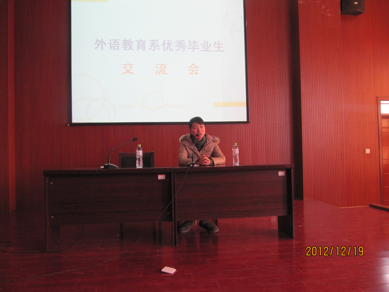 为加强大学生就业指导工作,帮助大学生树立正确的就业择业观,外语系邀请往届优秀毕业生重回母校,为学弟学妹传经送宝。12月19日上午,外语系04级毕业生刘莹莹和08级毕业生刘文静同学,在学校奂山讲坛为即将毕业的10级同学做了精彩的报告,并进行了热情交流。