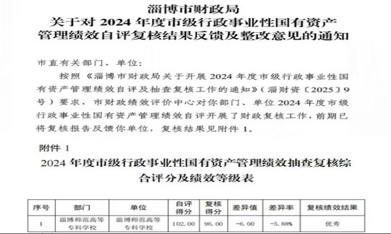 近日,市财政局发布《关于对2024年度市级行政事业性国有资产管理绩效自评复核结果反馈及整改意见的通知》,学校在此次抽查复核中表现突出,获评“优秀”等次。
