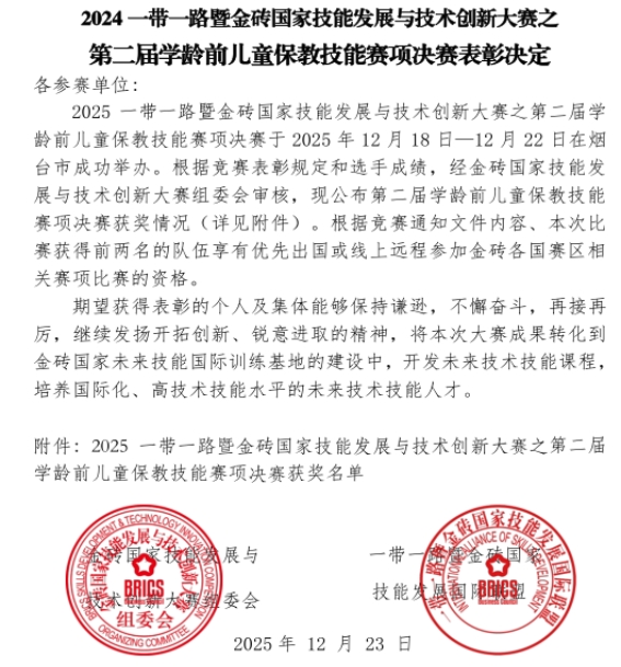 “一带一路”暨金砖国家技能发展与技术创新大赛是经金砖国家最高领导人会晤筹备委员会认可、中国外交部同意、金砖国家工商理事会批准的重要国际性赛事,比赛全面考察了选手们在学龄前儿童保育、教育等多方面的专业技能和实践能力。