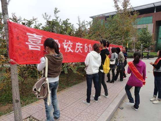 10月13日中午,我校大学生自律委员会学风建设部在一餐厅门口开展了“迎校庆 讲礼仪 争做文明大学生”倡议签名活动。活动现场,同学们积极踊跃的参加了签名活动,在条幅上郑重的写下了自己的名字,表达以健康、文明的形象迎接学校六十周年庆典的决心和对母校的美好祝愿!