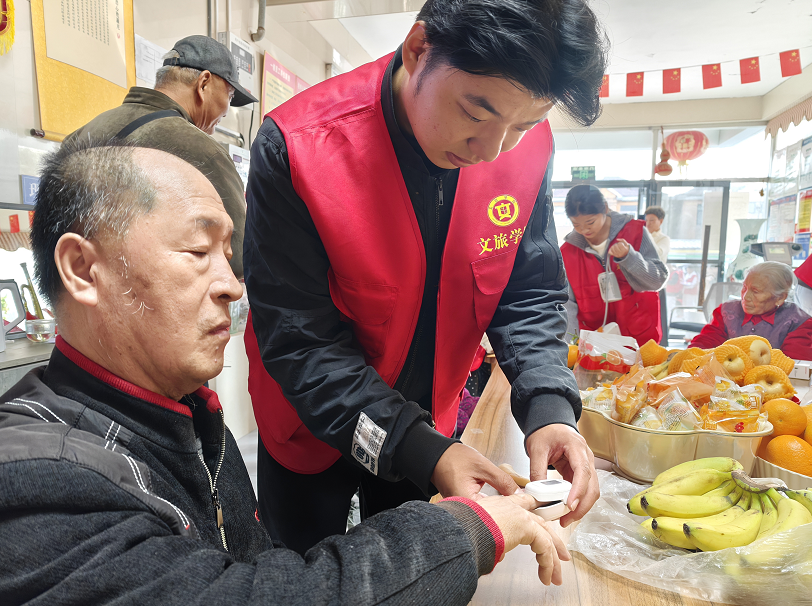 揭牌仪式后,师生党员将提前准备的大米、面粉等慰问物资逐一送到老人手中,与老人亲切交谈,详细询问饮食起居与健康状况。同时,学生充分发挥专业优势,现场演示指导老人练习“拍八虚”养生操、手指保健操等,耐心为每位老人测量血压,讲解秋冬季节健康防护知识,实现“服务”与“成长”的双向赋能。