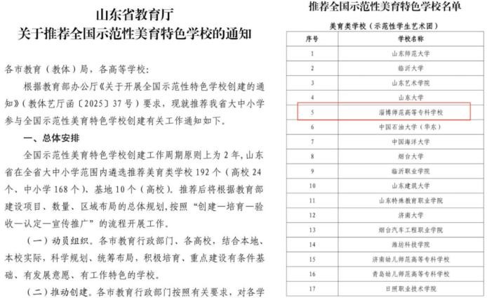 5.学校成功跻身全国示范性美育特色学校行列。依托行知合唱团作为全国示范性学生艺术团的建设基础,学校成功入选全国示范性美育特色学校行列,标志着学校在美育特色培育、成果凝练上实现了里程碑式突破,为厚植办学特色、赋能美育工作注入强劲动能。学校以“一团一品”为抓手,积极构建“一校多品”美育发展格局,常态化开展高品质艺术实践与交流,为全国美育特色学校建设提供可复制、可推广的“淄师方案”。