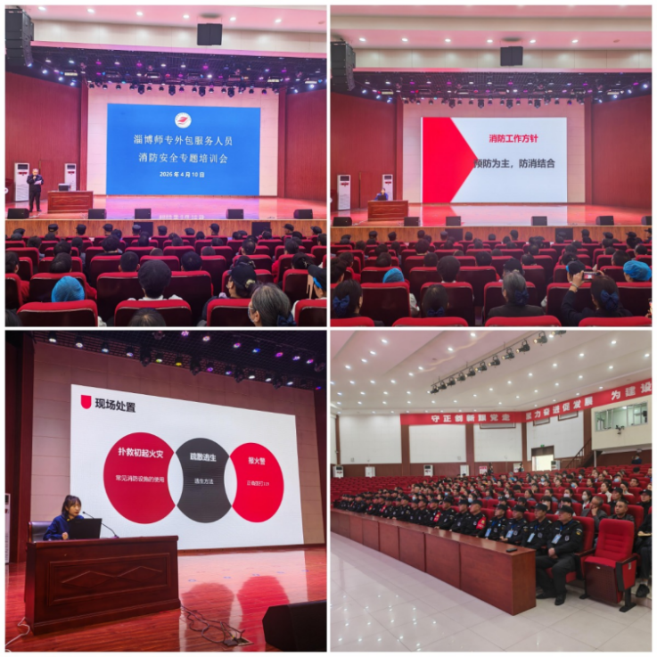 为切实增强全校外包服务人员的消防安全意识,提高火灾预防与应急处置能力,4月10日下午,学校组织开展了外包服务人员消防安全专题培训。本次培训邀请淄川消防救援大队专业消防教员全程指导。学校安保、餐厅、宿舍管理员及商业服务网点等全体外包服务人员参训。